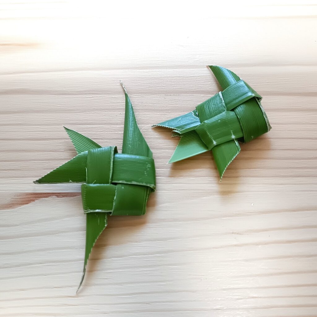 宜野湾市立博物館の企画展を見に行ったところ、共催でワークショップを実施している団体の方に声をかけていただき、即席のミニ体験をすることができました。「不器用でもできる簡単なものを」とリクエストして教えていただいたのが、写真にあるアダン葉を折って作る魚です。