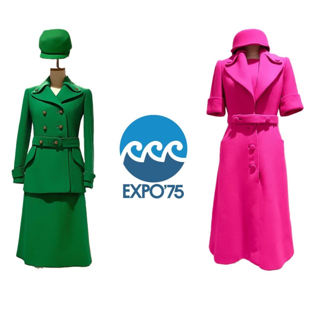 1975年の沖縄国際海洋博覧会の際、海洋文化館で着用されたユニフォーム (レプリカ) が展示されていたので写真を撮りました。ピンクの夏型とグリーンの合型、2つとも仕立ては (かつての) 沖縄三越が担当したそうです。 デザイン:中村 乃武夫・公益財団法人 日本ユニフォームセンター