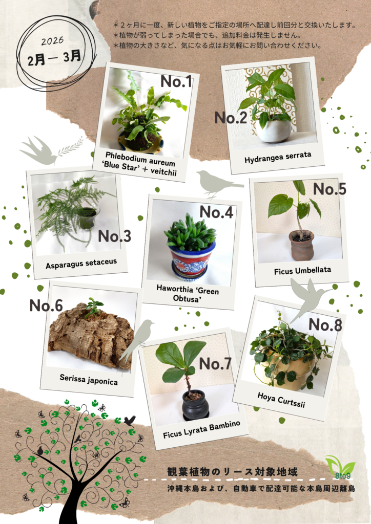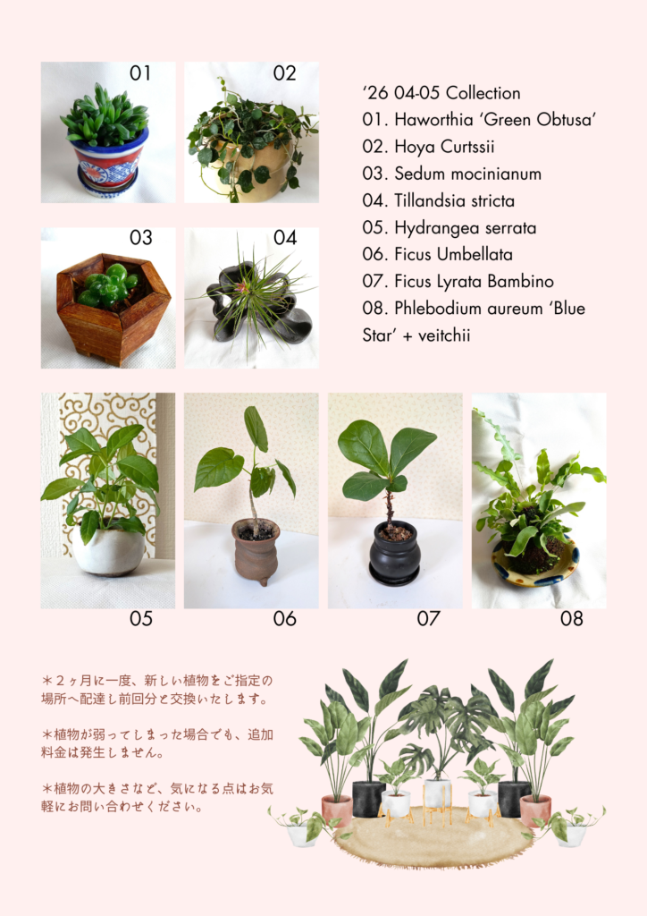植物のリースをご希望の方は「ふしぶし」コースをお選びください(料金は配達料込み)。