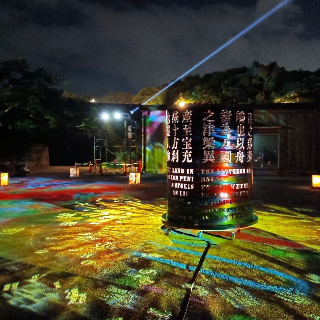 「首里城ファンタジアナイト」では、金網越しではありましたが正殿全体を眺めることもでき、完成が間近であることを実感できました。鐘の銘をモチーフとしたオブジェは、写真にあるように幻想的な空間を創り出していました。文字が光となって映し出されるなんて素敵です。